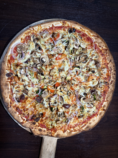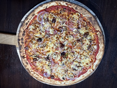 Tomato base, mozzarella, salami, capsicum, mushrooms, kalamata olives, Spanish onions