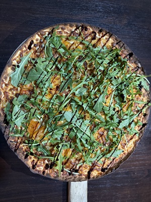 Olive oil base, mozzarella, oven-roasted pumpkin, caramelised onion, toasted pine nuts topped with roquette & balsamic glaze×