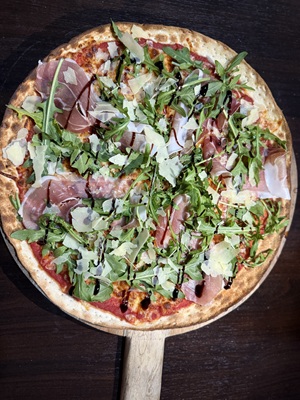 Roquette & ProsciuttoTomato base, mozzarella, dash of garlic, fresh prosciutto, balsamic glaze, topped with roquette & parmesan×